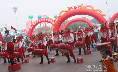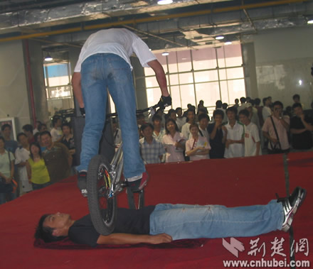 武漢市首屆時尚體育博覽會開幕式現場來自硚口區(qū)漢水橋街威風鑼鼓隊在開幕式上進行精彩的表演賽車俱樂部的車手和車模亮相東方神馬騎士俱樂部漂亮神氣的女騎士健身教練在進行健身表演極限單車高手有驚無險的表演