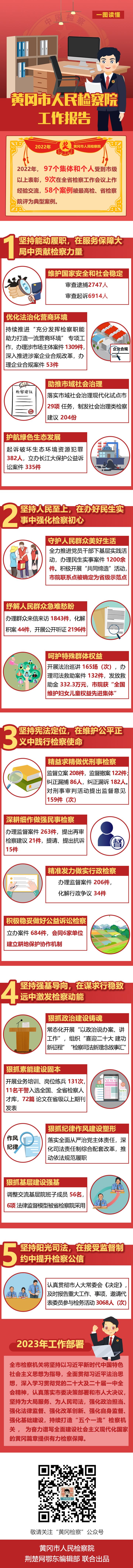 1月5日,黃岡市第六屆人民代表大會(huì)第二次會(huì)議開幕,黃岡市人民檢察院黨組書記、檢察長(zhǎng)萬(wàn)強(qiáng)向大會(huì)作《黃岡市人民檢察院工作報(bào)告》。2022年,黃岡市人民檢察院工作成效如何?2023年,有哪些工作部署?荊楚網(wǎng)(湖北日?qǐng)?bào)網(wǎng))帶您一圖讀懂。