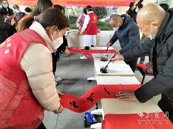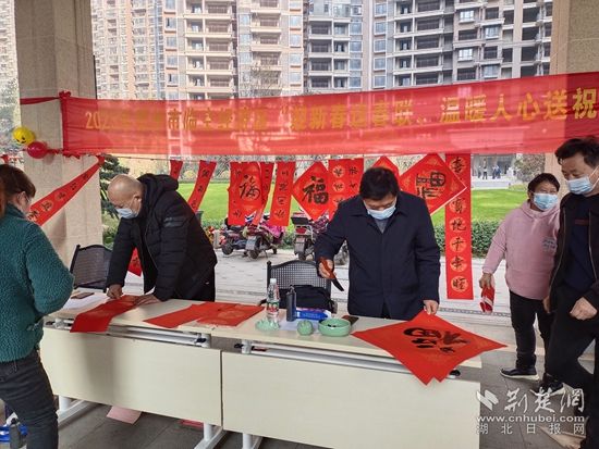 在銀海龍辰小區(qū),來自鄂州市書法協(xié)會的各位書法家現(xiàn)場“揮毫潑墨”,應小區(qū)居民的要求,現(xiàn)場書寫春聯(lián)和“?!弊?。此次活動,共計為居民書寫贈送160副春聯(lián)、100幅“?!弊?。