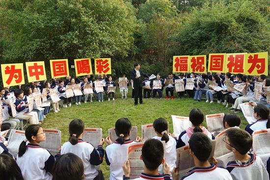 同學(xué)們手舉“踔厲奮發(fā) 砥礪前行”“為中國喝彩 為祖國祝?!钡葮?biāo)牌互動熱烈。
