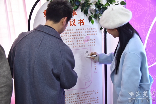 荊楚網(wǎng)(湖北日報網(wǎng))訊(通訊員 杜巧云、石姣、陳?。?/strong>“我承諾:抵制高價彩禮,為愛減負,拒絕低俗婚鬧,為愛守禮,主張婚事簡辦,為愛啟航,傳承優(yōu)秀文化,為愛踐行……”2月14日上午,大冶市婚姻登記處為當日上午登記領證的50對新人舉行“為愛減負,我承諾、我踐行”集體頒證活動,新人們在這個特殊的日子集體宣誓并在《婚俗改革倡議書》上簽字承諾。