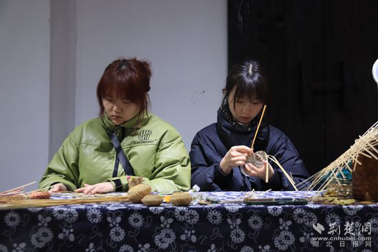 在演出現(xiàn)場旁的鄉(xiāng)村記憶館內(nèi),馬橋油畫風(fēng)景寫生展、鄂南雕花剪紙作品展同時(shí)吸引著游人的目光。來自湖北科技學(xué)院的學(xué)生正在展廳中編織特色竹制品,繪制富有當(dāng)?shù)孛袼滋攸c(diǎn)的文創(chuàng)作品。
