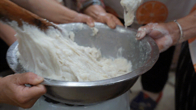 將糍粑捏成小團兒壓入