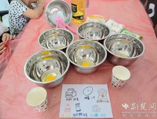 雞蛋、牛奶、面粉、白糖……在志愿者們的指導(dǎo)下,小朋友們添加食材、攪拌,現(xiàn)場(chǎng)井井有條。孩子們盡情享受“創(chuàng)造”的過程,不到一會(huì)時(shí)間,一塊塊香氣四溢的小蛋糕就端上了桌。