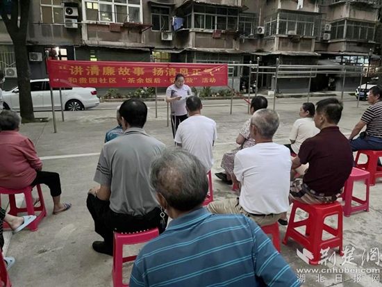 傍晚時(shí)分,身處湖濱花園小區(qū)的“和悠然 慢生活”休閑廣場,第二黨支部書記呂培根分享了《留得清氣滿乾坤》廉潔故事匯中的周恩來廉潔自律的故事。他勸誡領(lǐng)導(dǎo)干部們,要想成功度過思想、政治、社會(huì)、親屬和生活的五道關(guān)口,就必須堅(jiān)守共產(chǎn)黨員的政治操守和優(yōu)良作風(fēng)。