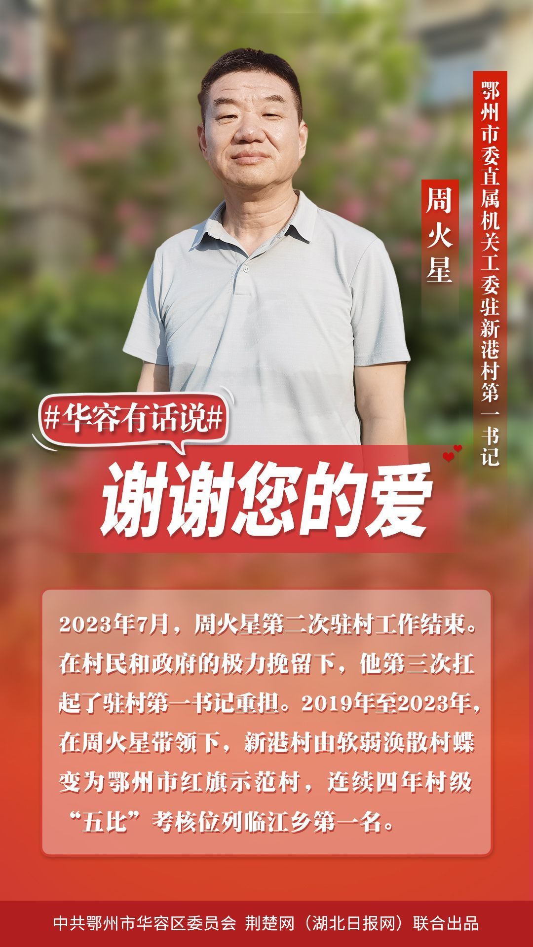 華容無(wú)所有,聊贈(zèng)一顆心。千恩萬(wàn)謝,訴不盡離別衷腸;千言萬(wàn)語(yǔ),道不盡感激之情。20多萬(wàn)華容百姓捎來(lái)心里話:“繼續(xù)駐村同志,攜手并肩前行;駐村結(jié)束返崗?fù)?,常回家看看,華容是您的第二故鄉(xiāng),是您永遠(yuǎn)的家!”