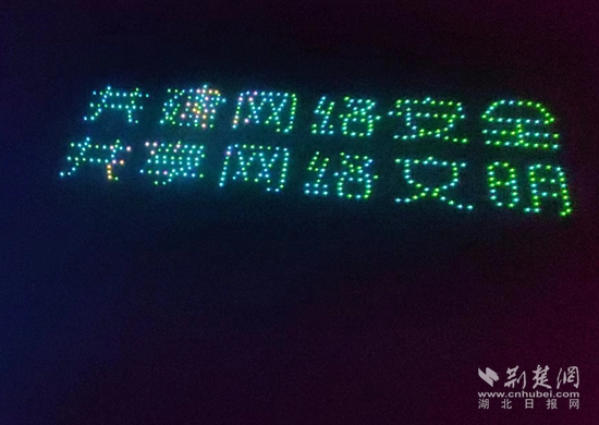 夜空中,數(shù)百架無人機以天空為畫布、以光影為畫筆,描繪出一幅幅科技與視覺的“大片”。表演融入網(wǎng)絡(luò)視聽元素和黃石、湖北地標內(nèi)容,依次幻化成小燕子、天空之城、黃石歡迎你、地球、安全盾牌等11個畫面,最終匯集成“共建網(wǎng)絡(luò)安全 共享網(wǎng)絡(luò)文明”的字樣。