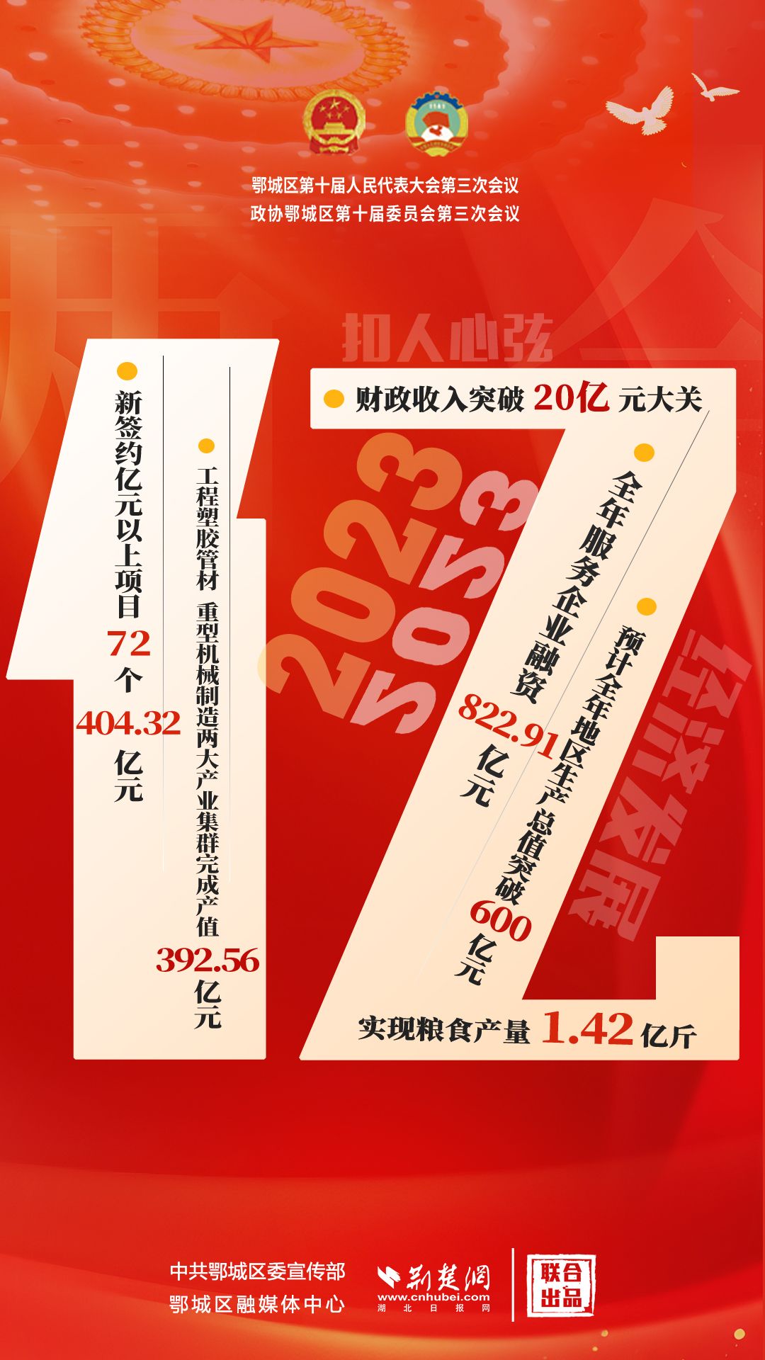 “億”解釋:2023年經(jīng)濟(jì)社會(huì)發(fā)展中,新簽約億元以上項(xiàng)目72個(gè)404.32億元,工程塑膠管材、重型機(jī)械制造兩大產(chǎn)業(yè)集群完成產(chǎn)值392.56億元,全年服務(wù)企業(yè)融資822.91億元,實(shí)現(xiàn)糧食產(chǎn)量1.42億斤,預(yù)計(jì)全年地區(qū)生產(chǎn)總值突破600億元,財(cái)政收入突破20億元,全區(qū)民生投入21.6億元。