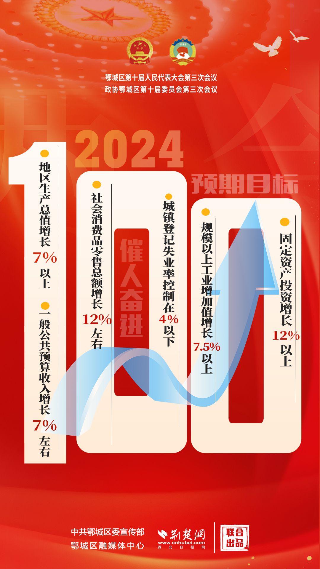 “100”解釋:2024年經(jīng)濟(jì)社會(huì)發(fā)展主要預(yù)期目標(biāo)是,地區(qū)生產(chǎn)總值增長(zhǎng)7%以上,一般公共預(yù)算收入增長(zhǎng)7%左右,社會(huì)消費(fèi)品零售總額增長(zhǎng)12%左右,城鎮(zhèn)登記失業(yè)率控制在4%以下,規(guī)模以上工業(yè)增加值增長(zhǎng)7.5%以上,固定資產(chǎn)投資增長(zhǎng)12%以上,服務(wù)業(yè)增加值增長(zhǎng)7.5%左右。