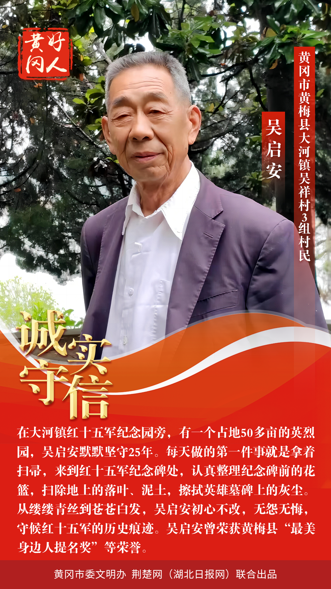 本期“黃岡好人”共有5組好人入選。他們中有“敬業(yè)奉獻,扎根商海40余載”的樊漢明;有“默默堅守25年,義務(wù)管理紅十五軍紀念園”的吳啟安;有“孝老愛親,被譽為大山里‘好兒媳’”的王志珍;有“見義勇為,先后5次救起落水群眾”的王臘;有“誠實守信,熱心勸學(xué)建書屋”的畢紅平。