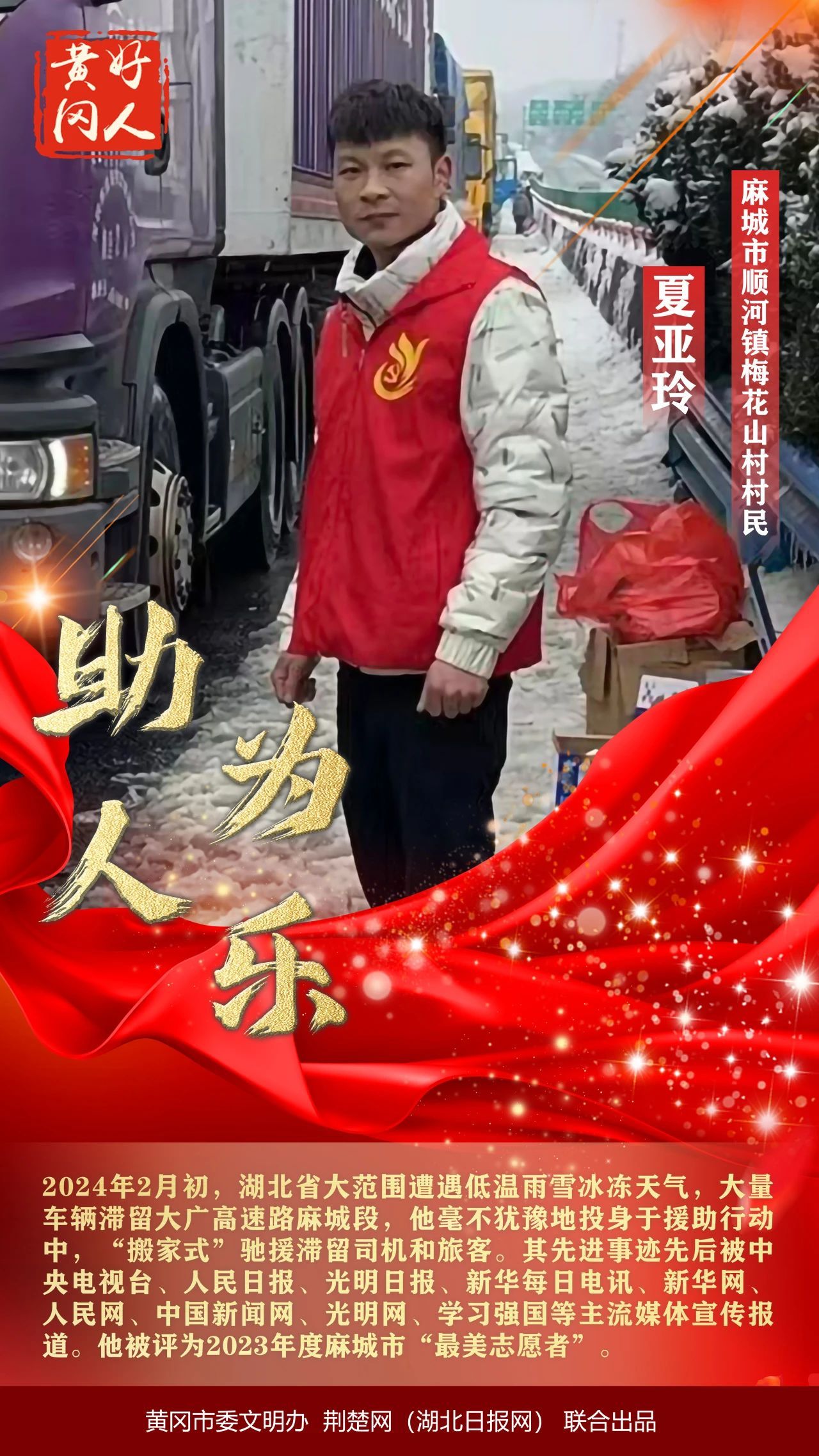 本期“黃岡好人”共有5組好人入選。他們中有風(fēng)雪中“搬家式”馳援滯留司機(jī)和旅客的夏亞玲;有返鄉(xiāng)創(chuàng)業(yè)助力鄉(xiāng)村振興,帶領(lǐng)村民共同致富的楊敬宇;有緊急時(shí)刻救助落水兒童的宋利華;有生死時(shí)速,徒手破車(chē)窗的民警黎剛;有27年無(wú)微不至照顧患病妻子的尤國(guó)才。