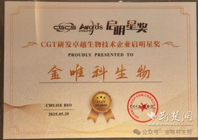 荊楚網(wǎng)(湖北日報(bào)網(wǎng))訊(通訊員 董高宣)近日,第六屆國際細(xì)胞與基因治療中國峰會(CGCS 2025)在南京揚(yáng)子江國際會議中心召開,同期舉行了CGCS Awards“啟明星獎”頒獎盛典。東湖高新集團(tuán)投資企業(yè)武漢禾元生物科技股份有限公司(以下簡稱“禾元生物”)因優(yōu)質(zhì)的產(chǎn)品與服務(wù)榮獲“CGT領(lǐng)域可靠原料與試劑供應(yīng)啟明星獎”,另一投資企業(yè)成都金唯科生物科技有限公司(以下簡稱“金唯科”)憑借其在基因治療領(lǐng)域的創(chuàng)新成果榮獲“CGT研發(fā)卓越生物技術(shù)企業(yè)啟明星獎”。