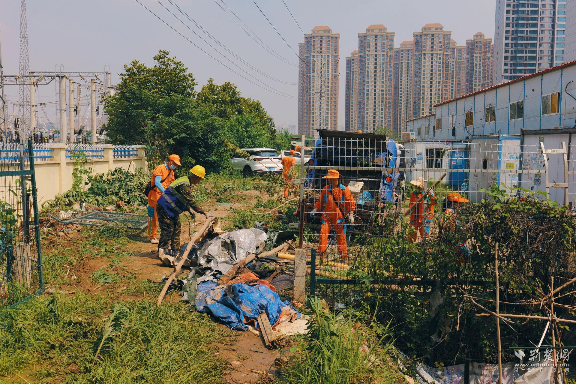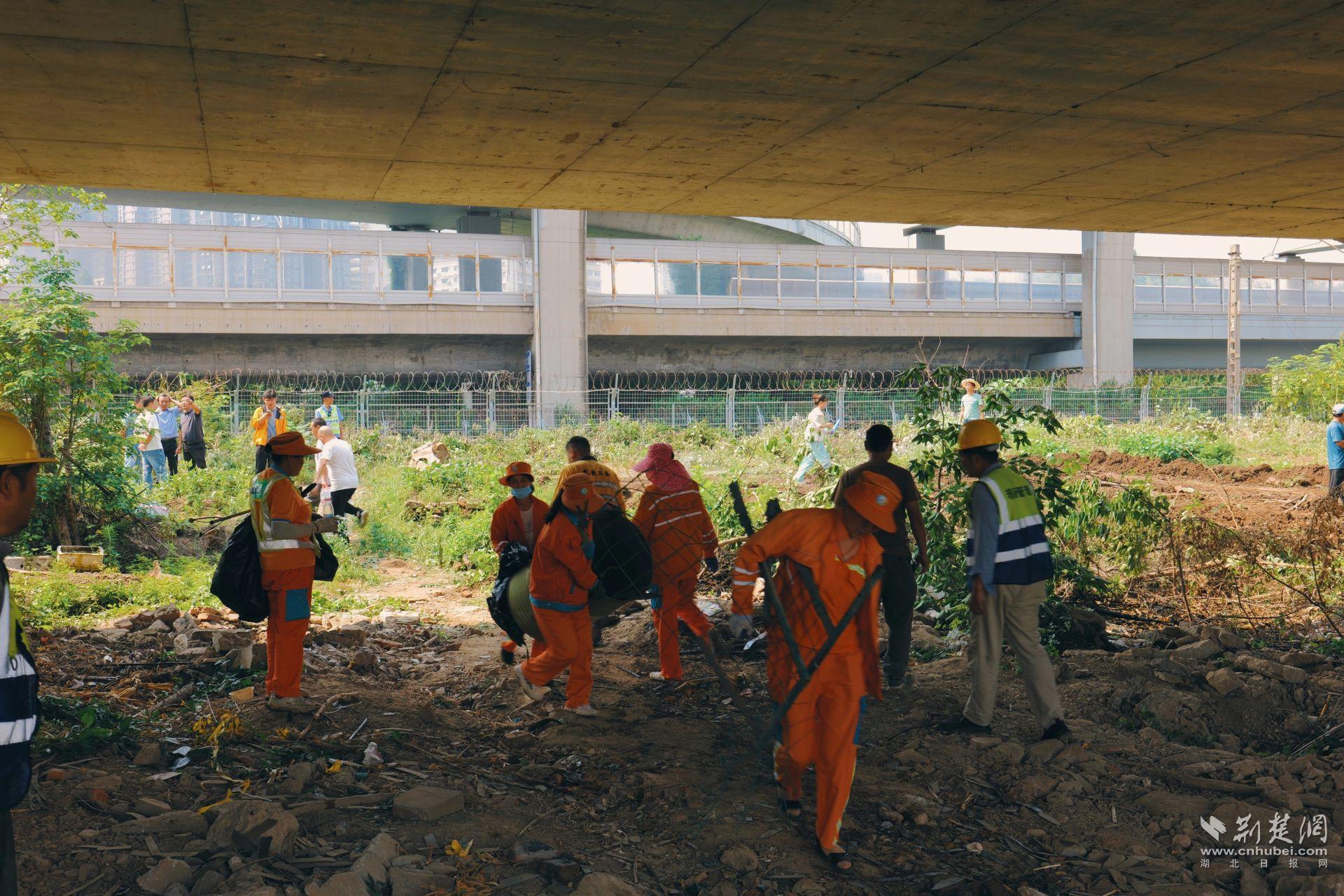 在區(qū)城管局牽頭動員下,執(zhí)法人員、環(huán)衛(wèi)力量聯(lián)合新村街道的干部職工、社區(qū)工作人員及武漢高鐵工務(wù)段技術(shù)人員以及公安干警們,共同組成200余人的攻堅隊伍,同時調(diào)度3臺大型挖掘機和4輛垃圾清運車,對鐵路橋下約3200平方米的“臟亂差”區(qū)域展開了拉網(wǎng)式清理。