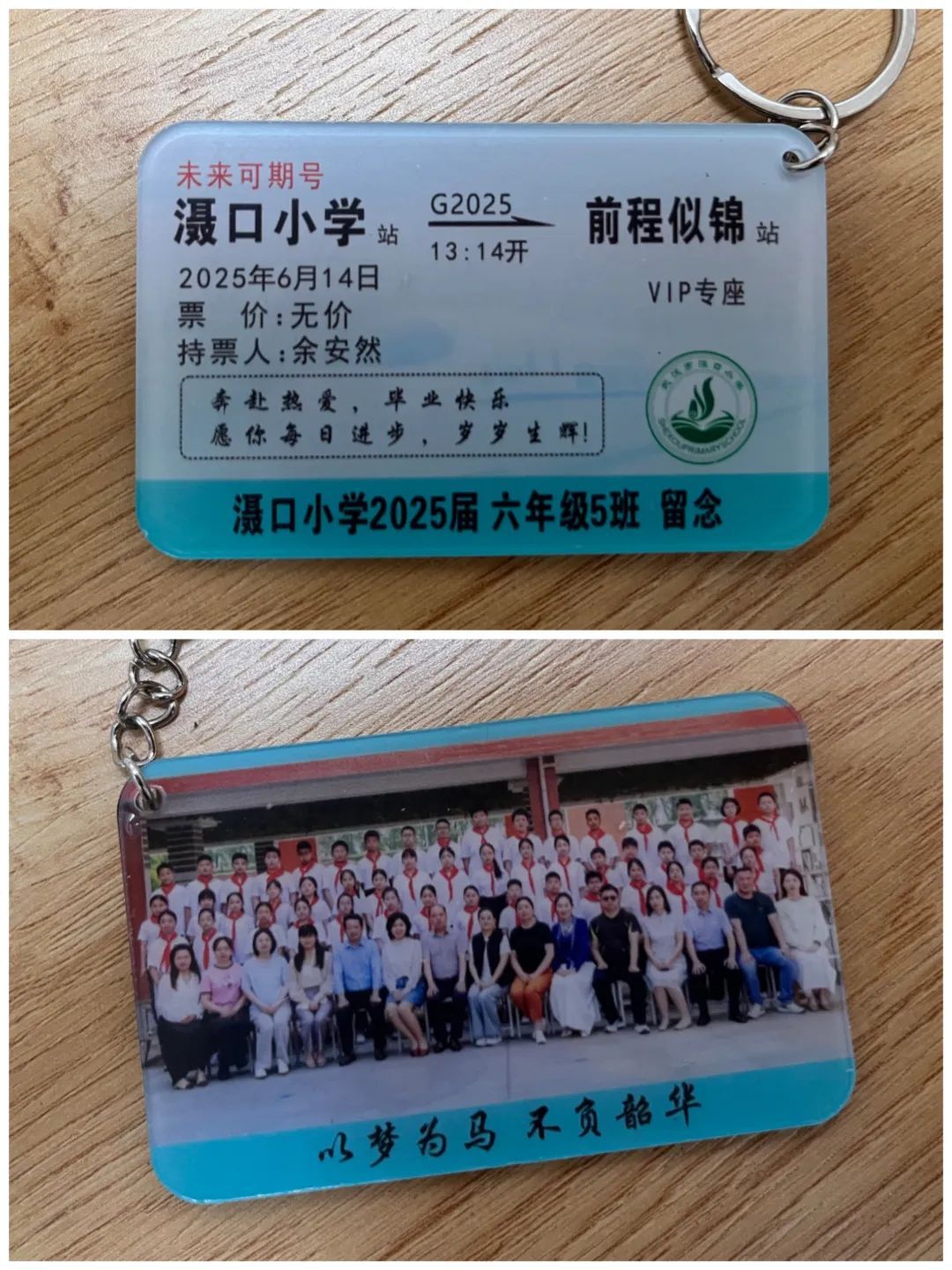 這張“火車票”不簡單,是獨一無二的定制款!這趟車叫“未來可期號”,車次是G2025,從“灄口小學”站開往“前程似錦”站。發(fā)車時間特意定在6月14日13時14分,這是孩子們在校的最后一天,意義非凡!每張票上都印著校徽,持票人是孩子們的名字。票價那一欄寫著“無價”,座位更是“VIP專座”,滿滿都是我對他們的愛和期許!