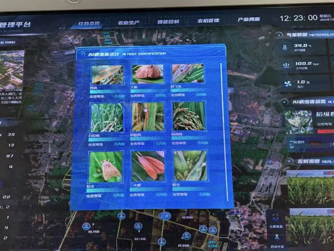 置身田間,每隔10畝地就佇立著一盞太陽能滅蟲燈。農(nóng)場控制室的智慧大屏上,害蟲種類、病蟲害風(fēng)險(xiǎn)預(yù)警等信息一覽無余。