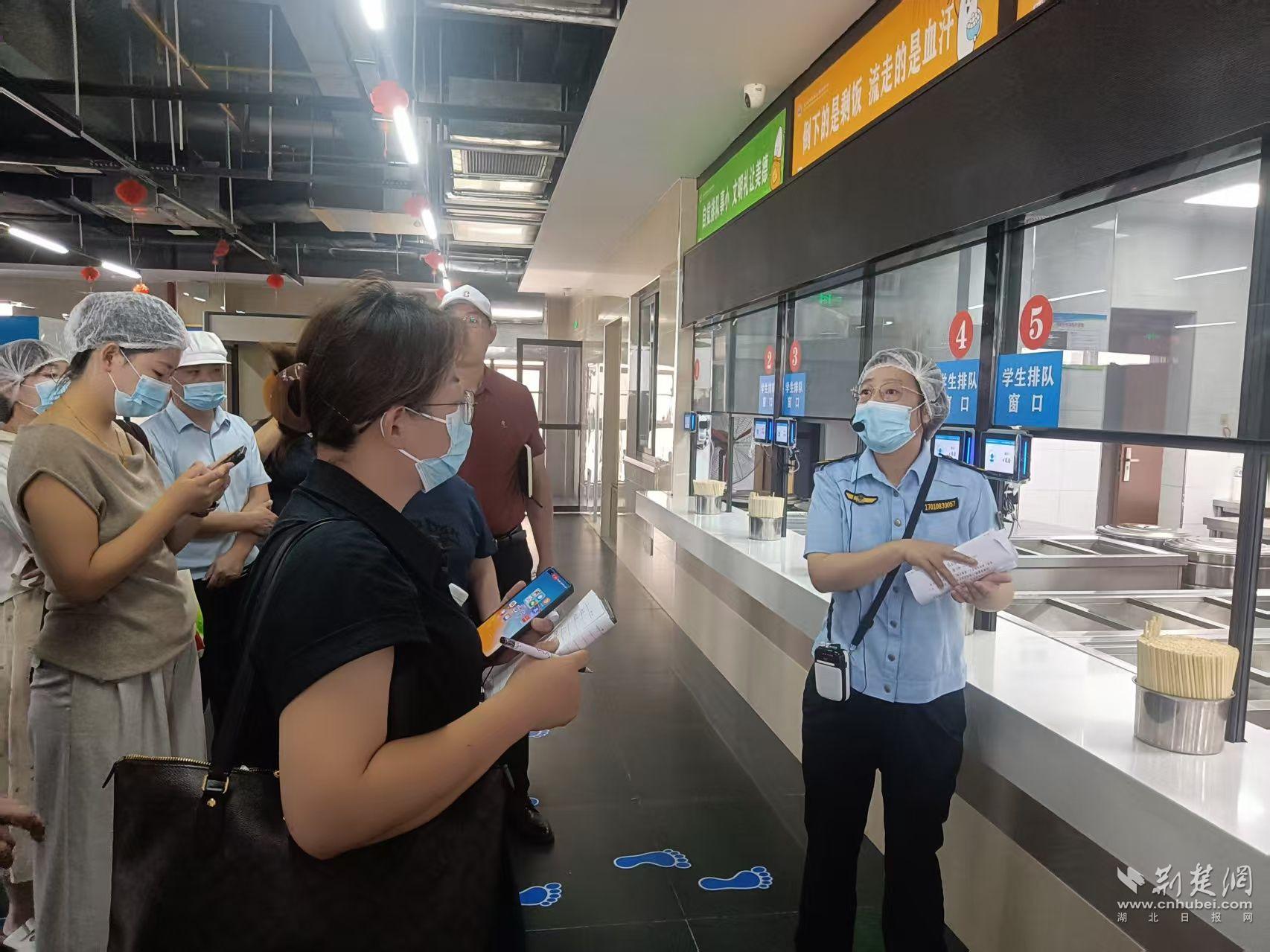 吳家山第四中學(xué)食堂內(nèi),工作人員正忙碌著為軍訓(xùn)學(xué)生做午餐。東西湖區(qū)市場監(jiān)管局餐飲科執(zhí)法人員帶領(lǐng)與會(huì)人員一邊實(shí)地觀摩,一邊現(xiàn)場授課。