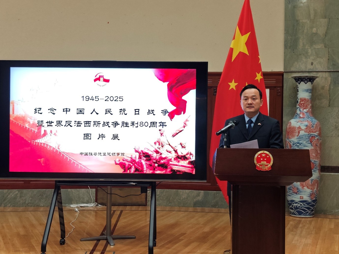 人民網(wǎng)斯德哥爾摩9月12日電 (記者殷淼)9月12日,中國駐哥德堡總領(lǐng)館隆重舉辦紀(jì)念中國人民抗日戰(zhàn)爭暨世界反法西斯戰(zhàn)爭勝利80周年圖片展和招待會。領(lǐng)區(qū)僑胞、留學(xué)生和社會各界人士300余人出席,中國駐哥德堡總領(lǐng)事楊培棟現(xiàn)場致辭。