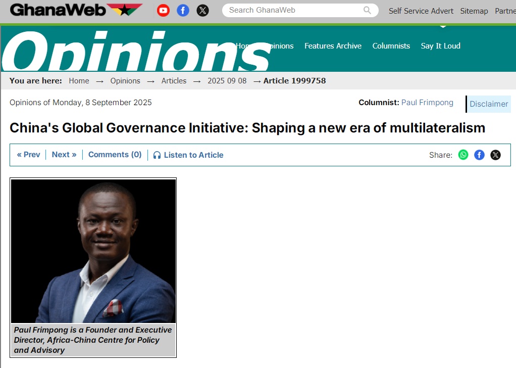 中國日報網(wǎng)9月12日電 加納新聞網(wǎng)站“Ghana Web”9月8日刊發(fā)加納非中政策咨詢中心執(zhí)行主任保羅·弗林蓬的署名文章《中國全球治理倡議:塑造多邊主義新時代》,對中國提出的全球治理倡議予以高度評價。