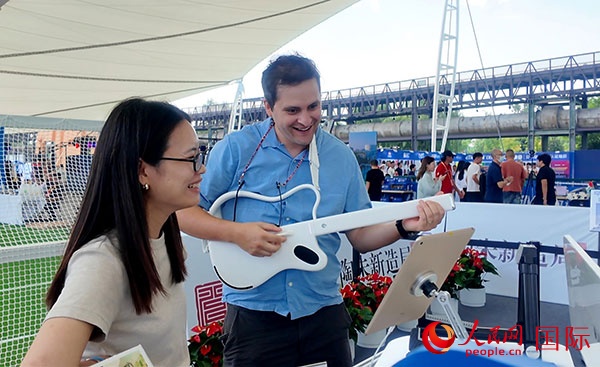 在服貿(mào)會(huì)體育服務(wù)展區(qū),觀眾體驗(yàn)“陶朱新造局”帶來新材料制作的吉他。人民網(wǎng)記者 吳凱攝