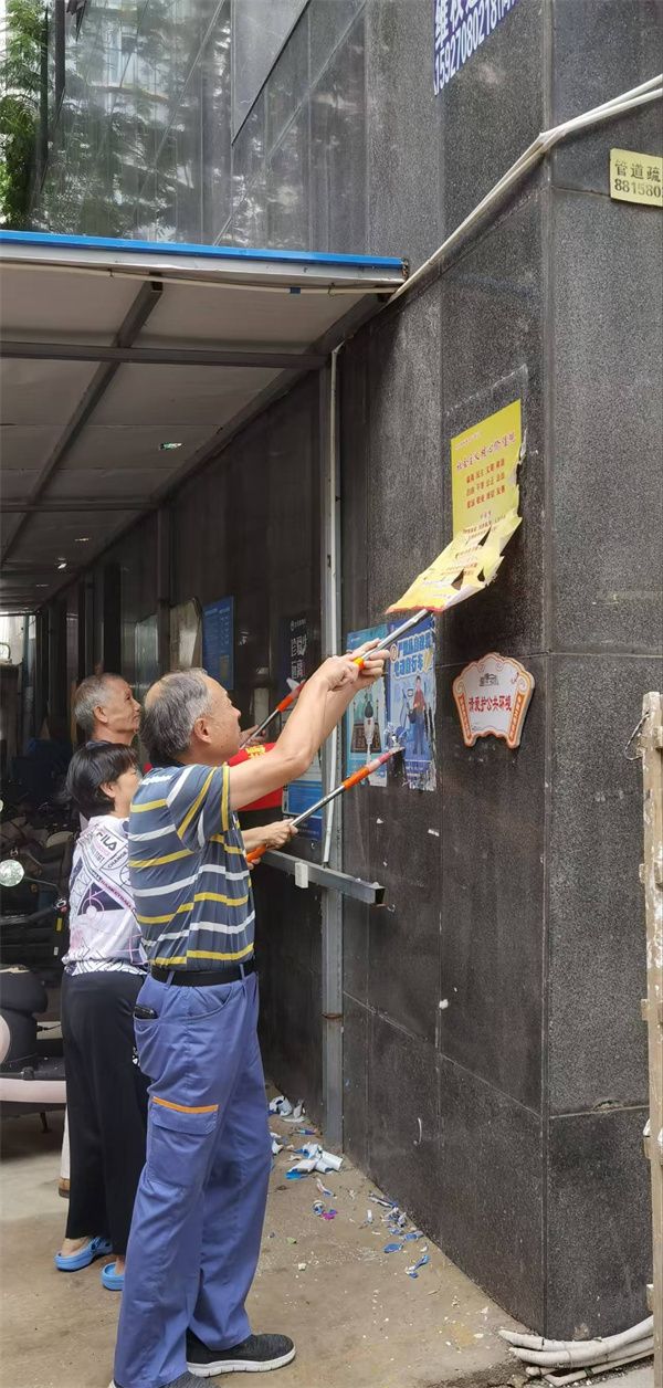 行動中,志愿者們分為兩組,分工協(xié)作、高效推進?!芭Fぐ_”清理組攜帶專業(yè)工具,對小區(qū)各樓棟墻面、單元門、電梯間及公共設施上的各類小廣告進行徹底清理。面對黏附牢固的廣告貼紙,大家先以噴壺濕潤軟化,再細致鏟除,最后用抹布擦拭干凈,不遺漏任何一處衛(wèi)生死角。