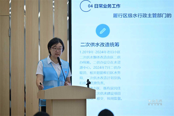 活動開場,武昌區(qū)水資源管理服務(wù)中心主任周妍圍繞《武昌區(qū)水務(wù)和湖泊局及水資源管理中心工作職責(zé)》展開解讀,清晰梳理水務(wù)部門在水資源調(diào)配、供水保障、設(shè)施維護(hù)等方面的職能;同時(shí)深入講解二次供水改造及修繕現(xiàn)行政策,從改造標(biāo)準(zhǔn)、申請流程到惠民福利逐一剖析,讓居民明晰這項(xiàng)民生舉措。