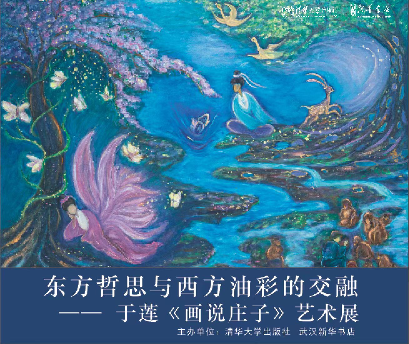 清華大學出版社特邀當代藝術家于蓮,耗時三年創(chuàng)作 27幅莊子主題油畫,以中西合璧的筆觸詮釋“天人合一”哲學。巨幅三聯(lián)畫《鯤鵬之變》用漸變的藍紫色調展現(xiàn)莊子的宏大宇宙觀,四聯(lián)畫《至樂》則以明麗色彩解構生死命題。