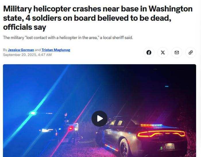 中新網9月20日電 綜合外媒報道,美國陸軍特種作戰(zhàn)司令部當地時間9月19日確認,一架MH-60“黑鷹”直升機日前在華盛頓州劉易斯-麥科德聯合基地附近墜毀,事故或造成4名士兵遇難。