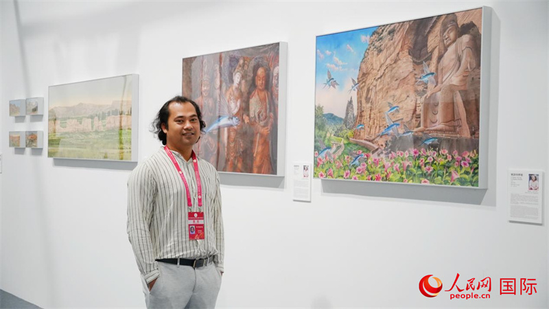孟加拉國藝術家蒙蒙爍在其畫作前接受人民網(wǎng)采訪。人民網(wǎng) 嚴小晶攝