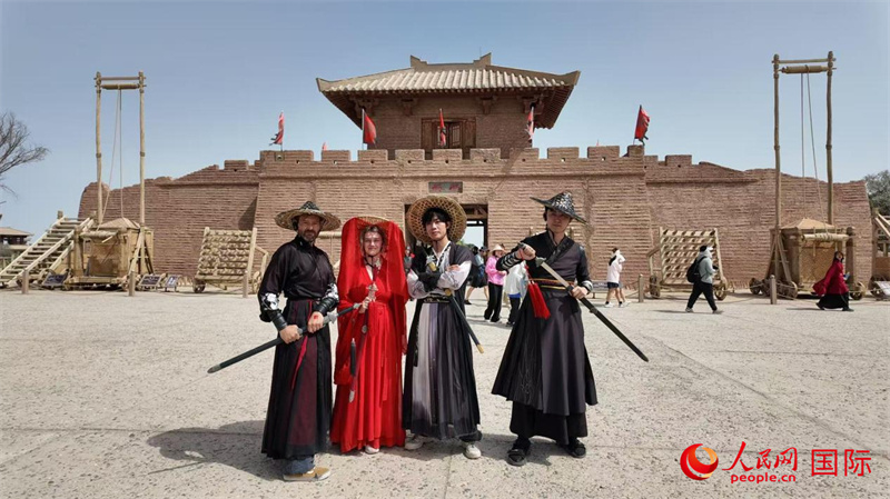 意大利藝術家馬泰奧、羅馬尼亞藝術家安德烈婭與中國藝術家吳穹等體驗中國傳統(tǒng)服飾。人民網(wǎng) 嚴小晶攝