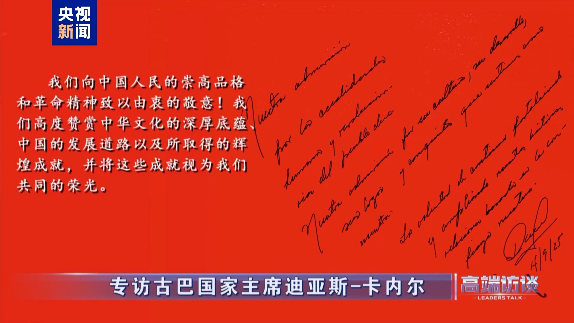 古巴國家主席迪亞斯-卡內(nèi)爾在接受總臺專訪后題詞:
