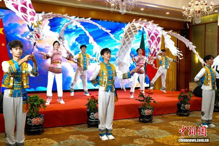 9月26日,慶祝中華人民共和國(guó)與孟加拉人民共和國(guó)建交50周年招待會(huì)現(xiàn)場(chǎng)演出的白族舞蹈《白族彩帶龍》。 羅婕 攝