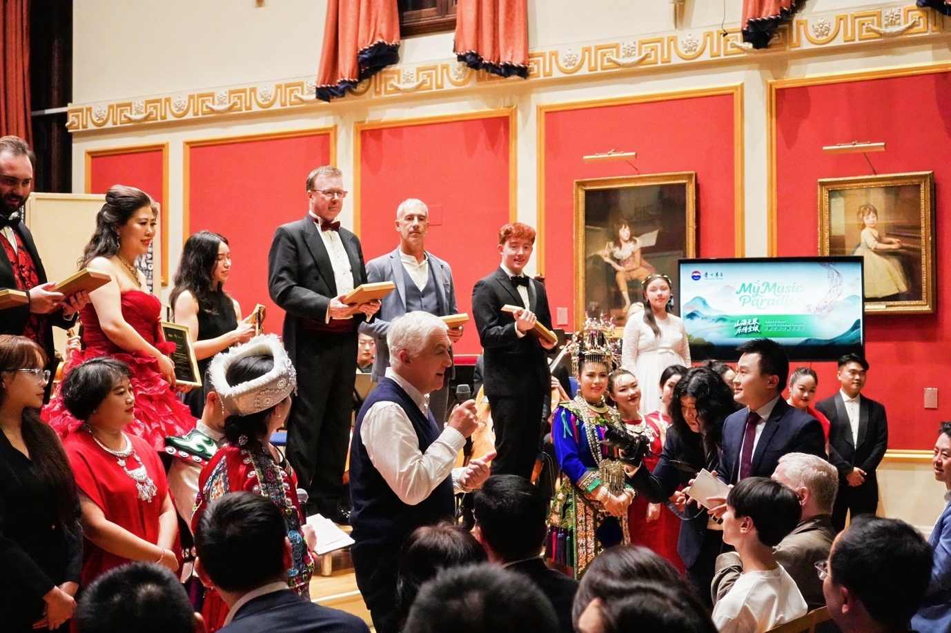 本次音樂會還特設(shè)榮譽(yù)授予環(huán)節(jié),為貴州文演集團(tuán)20名音樂家及6名歐洲音樂家頒發(fā)“中歐音樂大使”稱號,以鼓勵他們履行“以音樂為橋梁、促進(jìn)人文交流”的承諾。 首次登上英國舞臺的貴州音樂家楊勝東難掩激動:“第二次搭檔我們更顯默契,中西方音樂碰撞出了新的韻味?!?/p>
