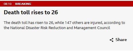 中新網(wǎng)10月1日電 據(jù)英國(guó)廣播公司(BBC)等外媒報(bào)道,菲律賓國(guó)家減災(zāi)管理委員會(huì)稱(chēng),截至當(dāng)?shù)貢r(shí)間10月1日8時(shí),9月30日發(fā)生在該國(guó)宿務(wù)省的6.9級(jí)地震已造成26人死亡、147人受傷,2個(gè)市鎮(zhèn)已經(jīng)宣布進(jìn)入災(zāi)難狀態(tài)。