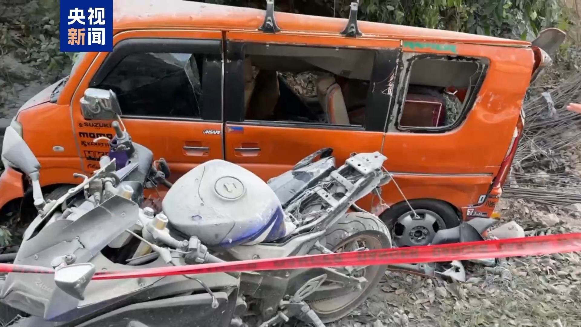 總臺記者 黃錚錚:山體滑坡還對當?shù)鼐用裆钤斐闪撕艽笥绊?,載客小型車輛及幾輛摩托車在山體滑坡事故中受損。(總臺記者 黃錚錚)