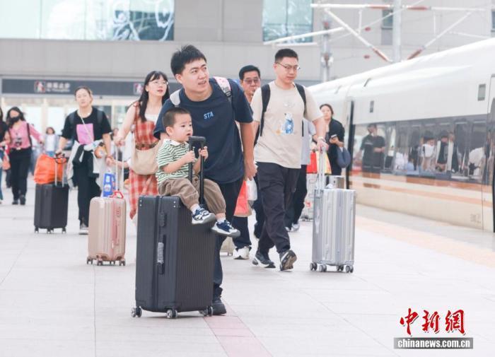 10月1日,國(guó)慶中秋假期首日,家長(zhǎng)帶著孩子在北京北站乘車。當(dāng)日,中國(guó)鐵路迎來(lái)國(guó)慶中秋假期客流最高峰,預(yù)計(jì)發(fā)送旅客2300萬(wàn)人次,計(jì)劃加開(kāi)旅客列車2106列。中新社記者賈天勇攝