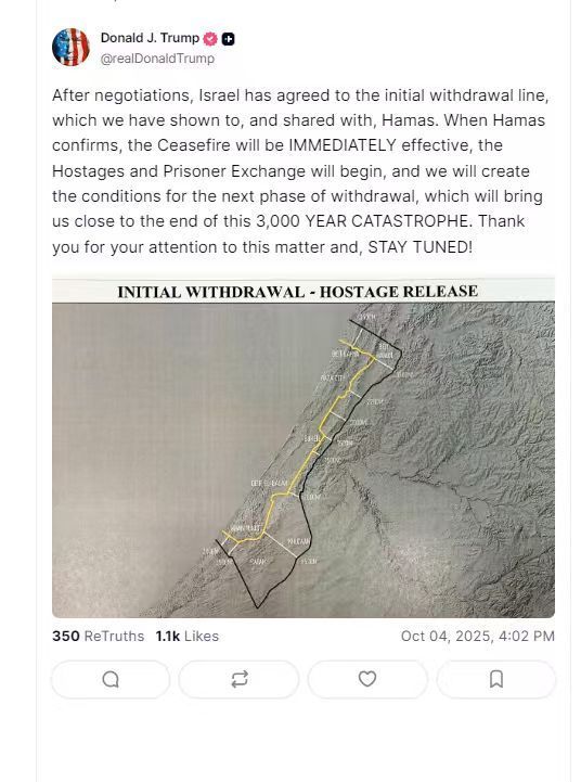 當?shù)貢r間10月4日,美國總統(tǒng)特朗普在其社交平臺“真實社交”發(fā)文稱,以色列已同意加沙地帶初步撤軍路線,并將相關(guān)方案與巴勒斯坦伊斯蘭抵抗運動(哈馬斯)共享。一旦哈馬斯確認,停火將立即生效,被扣押人員與囚犯交換隨即啟動。