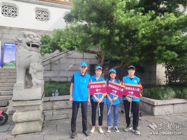 西廠口社區(qū)“市民園長”志愿團隊在黃鶴樓景區(qū)開展文明引導與旅游咨詢。 通訊員供圖