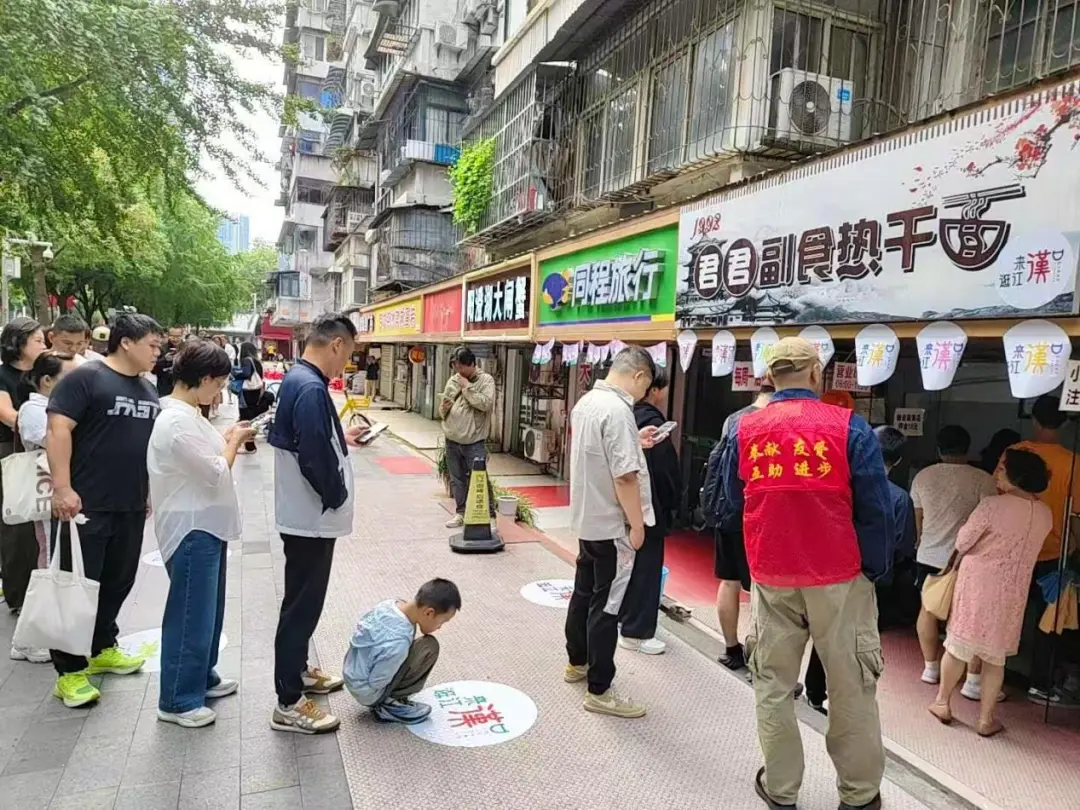國慶中秋假期,江漢區(qū)游客量激增,君君副食的隊(duì)伍從店門口蜿蜒著排出數(shù)十米。社區(qū)志愿者舉著醒目的提示牌引導(dǎo)停車,網(wǎng)格員把路邊的共享單車統(tǒng)一移走,引導(dǎo)著慕名而來的食客井然有序地排隊(duì)等候?!耙郧耙坏焦?jié)假日就發(fā)愁,客人擠得轉(zhuǎn)不開身,現(xiàn)在有專人維持秩序,生意反而更穩(wěn)當(dāng)了?!钡曛饔喟⒁滩林~頭的汗笑言。