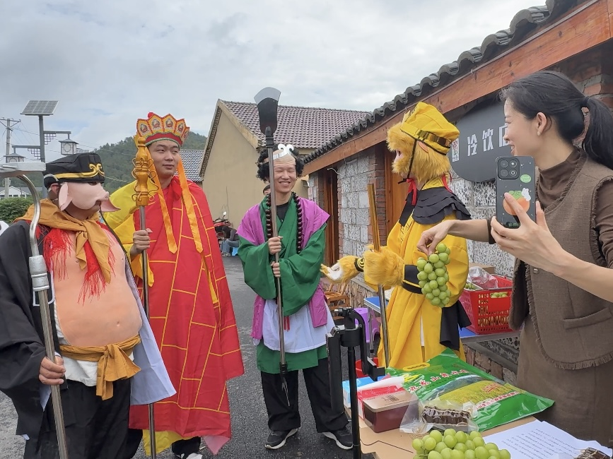 為了增添活動的趣味性和傳播力,鎮(zhèn)黨委、政府特別安排了志愿者扮演唐僧師徒四人,作為推薦官在直播間為大家推薦各類好物,吸引了不少粉絲進(jìn)到直播間。隨后,還沿著林澗小隱、魚鱗壩巡展,與村民互動,不僅為展銷會增添了歡聲笑語,也讓鄉(xiāng)村振興的理念以更生動的方式深入人心。