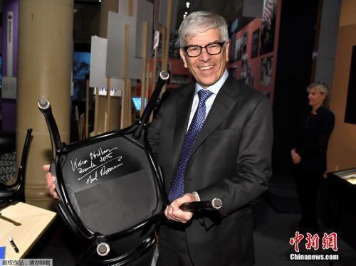 資料圖:2018年諾貝爾經濟學獎獲得者保羅·羅默展示其簽名的椅子。