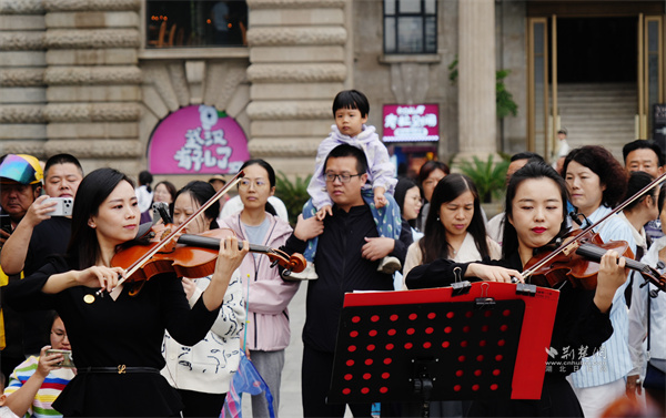 來自阿曼的游客Murad Al Balushi難掩興奮,特意讓朋友為自己和樂團(tuán)拍下合影?!斑@場演出太精彩了,現(xiàn)場的氛圍讓人沉醉,武漢街頭的這份浪漫很獨(dú)特。”Murad Al Balushi表示。來自廣東珠海的游客曹先生,剛下火車便將江漢路作為旅途第一站,而這場音樂快閃成為他此行的意外之喜?!案哐乓魳放渖习倌赙姌堑膹?fù)古建筑,氛圍感直接拉滿,這趟旅行的開頭太完美了。”武漢市民李女士帶著家人在休息日出游,剛從公交站下車就被樂聲吸引,“本來就是隨便逛逛,正好帶著寶寶感受一下音樂氛圍。”江漢大學(xué)大四學(xué)生小劉和朋友一同被這場音樂“快閃”所打動,拍下視頻發(fā)朋友圈和大家分享。她表示:“武漢這座城市越來越有活力,總能給人驚喜。”