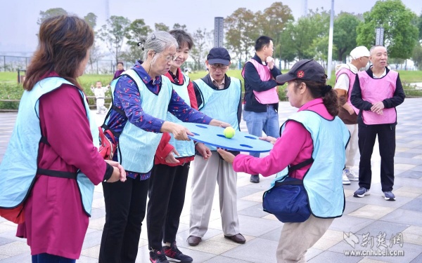 活動現(xiàn)場設置了三個互動游戲區(qū)域,“不倒森林”游戲中,老人們圍成一圈,默契配合轉(zhuǎn)動長桿;“四平八穩(wěn)”環(huán)節(jié),大家小心翼翼地操控游戲道具,努力保持小球平衡;“同舟共濟”時,三人一組相擁站在墊子上協(xié)同挪動。這些趣味拓展活動不僅鍛煉了老人們的協(xié)調(diào)能力,更在歡聲笑語中增進了鄰里情誼。