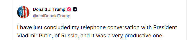 在16日稍晚時,美國總統(tǒng)特朗普在其個人社交媒體平臺上發(fā)布了同俄羅斯總統(tǒng)普京當天通話的內(nèi)容,并積極表態(tài)稱,此次通話非常富有成效。在特朗普相關(guān)聲明發(fā)出后不久,俄羅斯總統(tǒng)特使德米特里耶夫也發(fā)聲表示,兩國總統(tǒng)的通話“積極且富有成效”,雙方明確了下一步的行動方案。