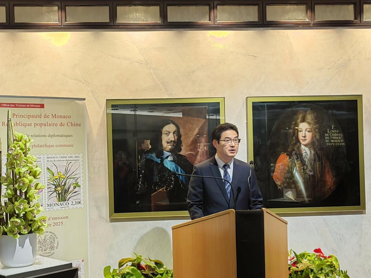 何有麟在致辭中指出,紀念郵票以中國春蘭和摩納哥風(fēng)鈴草并蒂成圖,體現(xiàn)了雙方在生態(tài)保護和可持續(xù)發(fā)展等方面的共同理念,象征兩國人民的深厚友誼。