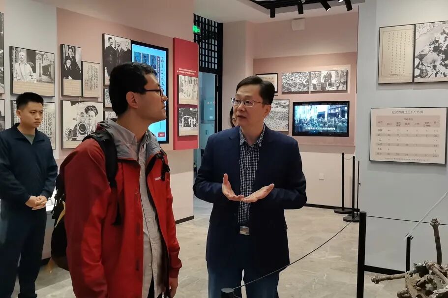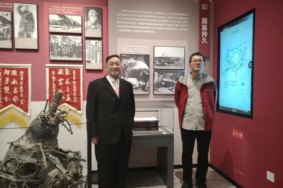 在周靜館長帶領(lǐng)下,小林拓也、中國空軍勇士陳懷民烈士侄子陳德、民間收藏家代表周啟壯、武漢人文歷史愛好者袁厚翔等一行,首先參觀了基本陳列《英雄城市 抗戰(zhàn)烽火——武漢抗戰(zhàn)歷史特展》,詳細了解了全民族抗戰(zhàn)爆發(fā)后,武漢逐步成為當時全國抗戰(zhàn)中心和武漢保衛(wèi)戰(zhàn)的相關(guān)史實,以及為鞏固、發(fā)展抗日民族統(tǒng)一戰(zhàn)線,周恩來、博古、董必武、葉劍英等中國共產(chǎn)黨人在武漢所做的各種努力。