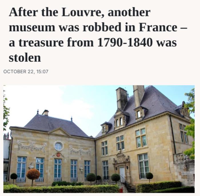 中新網(wǎng)10月23日電 據(jù)外媒當(dāng)?shù)貢r(shí)間22日?qǐng)?bào)道,在巴黎盧浮宮博物館發(fā)生搶劫案后不久,法國(guó)另一家小型博物館失竊,約2000枚金幣和銀幣被盜。事發(fā)后該博物館暫時(shí)關(guān)閉。