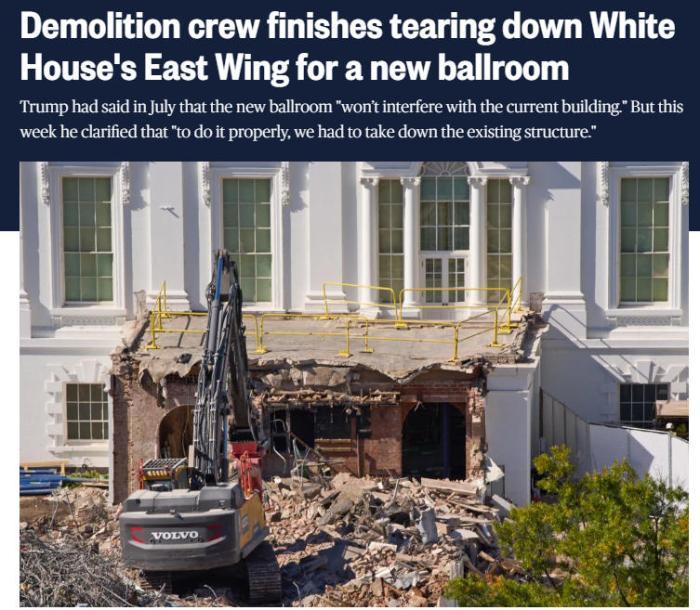 特朗普曾在7月表示,這個(gè)宴會(huì)廳“不會(huì)影響現(xiàn)有建筑”,但他10月22日表示,在“與全球頂尖建筑師進(jìn)行了大量研究”后,決定“最好從頭開始”。