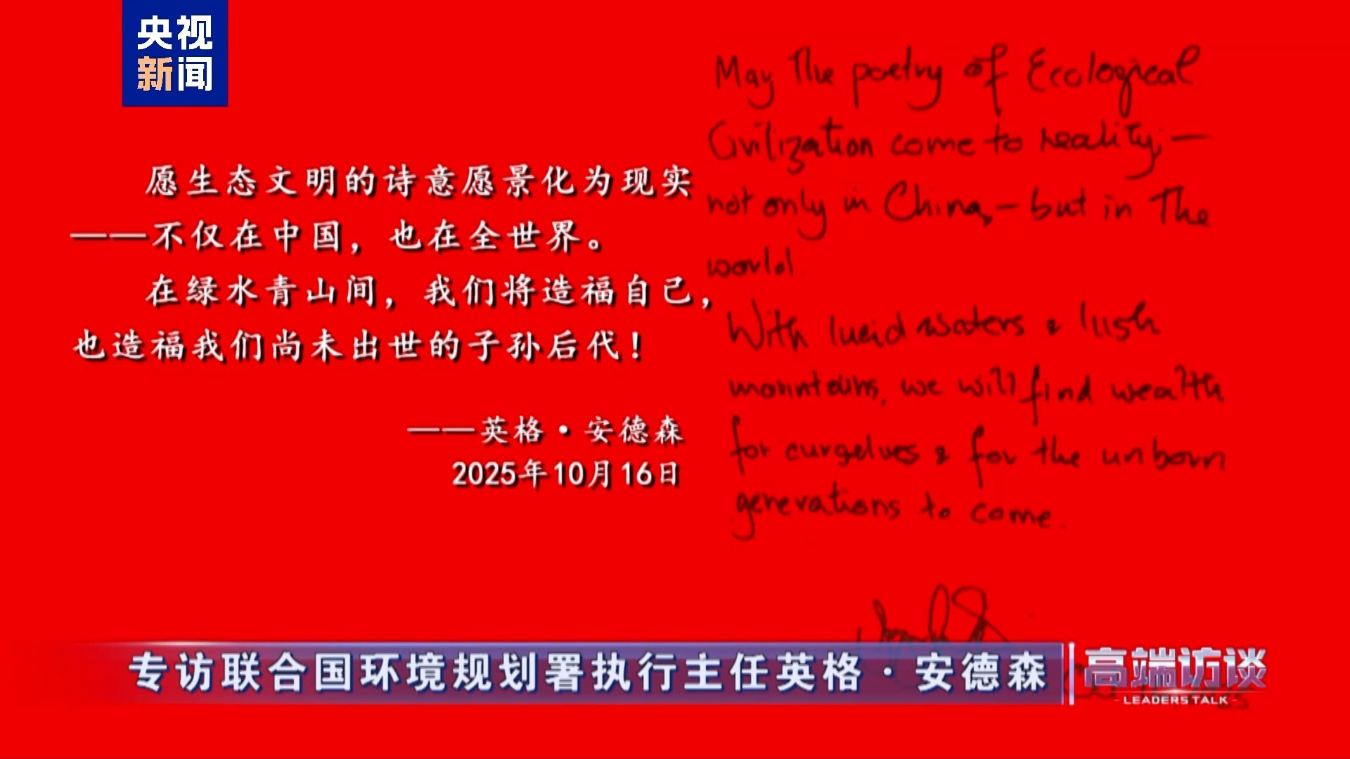 聯(lián)合國(guó)環(huán)境規(guī)劃署執(zhí)行主任英格·安德森在接受總臺(tái)專訪后題詞: