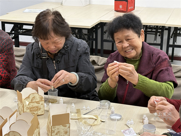 在大歌笛湖小區(qū)鄰里客廳內(nèi)熱鬧非凡,水拓扎染絲巾的制作現(xiàn)場(chǎng),老人們按照工作人員講解的步驟興致勃勃地動(dòng)手實(shí)踐,讓一幅幅色彩斑斕、花紋各異的絲巾作品逐漸成型,老人們拿著自己親手制作的絲巾,成就感滿滿。天然蜂蠟護(hù)手霜DIY環(huán)節(jié),大家按照配比將蜂蠟、橄欖油等材料混合加熱、攪拌、裝罐,制作出天然無(wú)添加的護(hù)手霜,既實(shí)用又健康。鄰里客廳外的便民服務(wù)也同步貼心上線,免費(fèi)理發(fā)、血壓測(cè)量、法律咨詢等服務(wù),切實(shí)幫助老年人解決實(shí)際需求,讓“笛韻”成為串聯(lián)健康、睦鄰、便利生活的“銀齡生活協(xié)奏曲”,串聯(lián)起銀齡幸福生活。