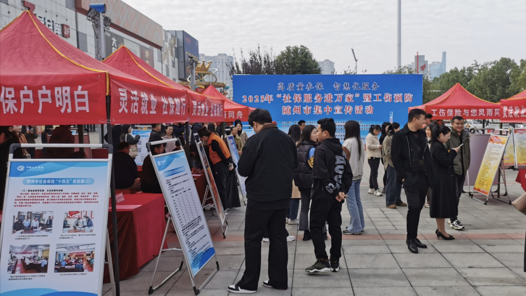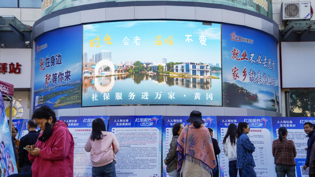 黃岡市“社保服務進萬家”活動現(xiàn)場,群眾在社保政策宣傳展板前駐足觀看。